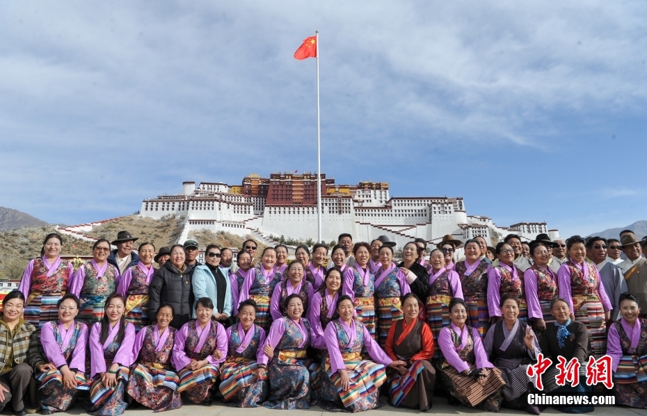 3月28日,西藏各族各界人士聚集在拉薩布達(dá)拉宮廣場,升國旗、唱國歌,參加西藏百萬農(nóng)奴解放65周年紀(jì)念活動。圖為民眾身著盛裝在布達(dá)拉宮廣場留影。中新社記者 貢嘎來松 攝