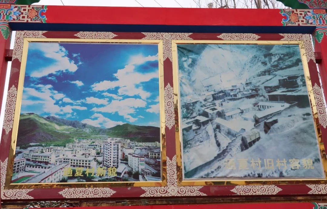 而在通夏村門口,兩幅照片十分顯眼,一幅是通夏村新貌,一幅是舊貌。在舊貌中,低矮的土平房在大雪積壓下,東零西落地散布在起起伏伏的坡面上,冰雪覆蓋的泥濘小道幾乎無(wú)法通行。“這樣的土坯房我和先輩們住了幾十年,更早以前,甚至都沒(méi)有房子,放牧到哪里,帳篷就支到哪里?!苯衲?3歲的村民達(dá)瓦扎巴指著老照片說(shuō)。而在一旁新貌圖中,蔚藍(lán)的天空下一幢幢藏式小樓整齊林立,寬敞的水泥路通家達(dá)戶,一派欣欣向榮的景象……