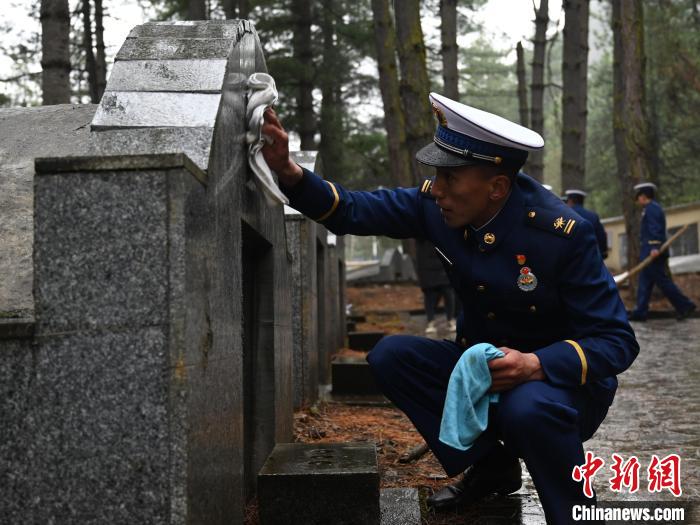圖為波密中隊(duì)指戰(zhàn)員為烈士墓碑擦拭浮塵。林芝市森林消防支隊(duì)波密縣中隊(duì)供圖