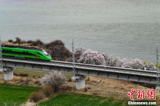 復(fù)興號動車組不僅是一種便捷的交通方式,更成為了一種獨(dú)特的旅游體驗,讓游客能夠近距離欣賞到西藏林芝春季獨(dú)特的自然美景。圖為穿梭在桃花林中的拉林鐵路高原復(fù)興號。