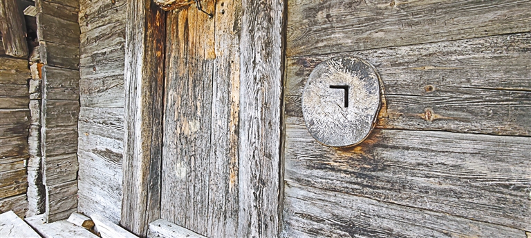 在村民的幫助下,我們依著鎖孔的形狀,將鑰匙平放進(jìn)去,沉進(jìn)鎖芯的孔道中,憑感覺挑起用小木塊做成的栓子,把沉重的木鎖從門邊的鎖洞中移除。接著,再用手伸進(jìn)鎖洞中摸索著移動(dòng)房門后的木栓,即內(nèi)鎖,多次嘗試后終于打開了一間糧倉!