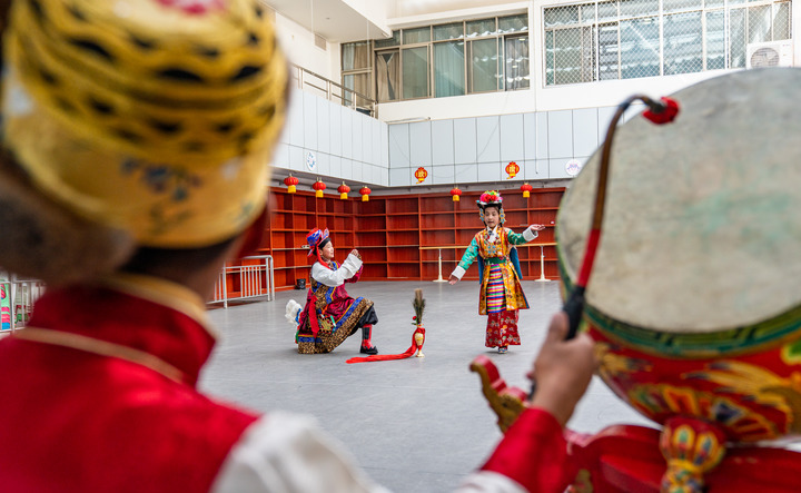 藏戲小演員為表演伴奏。新華社記者 丁增尼達 攝