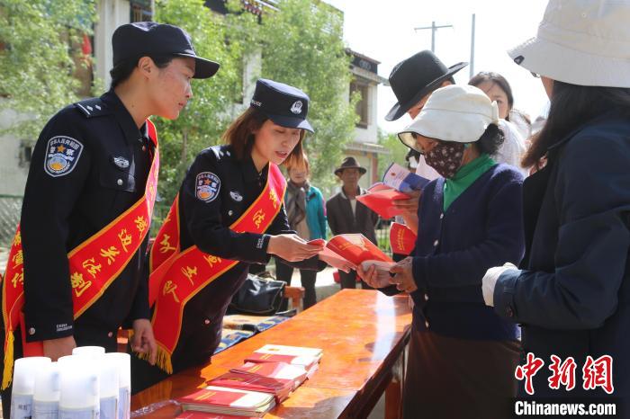 圖為西藏邊檢總站執(zhí)法調查支隊民警向民眾普及《民法典》知識。徐錫萬 攝