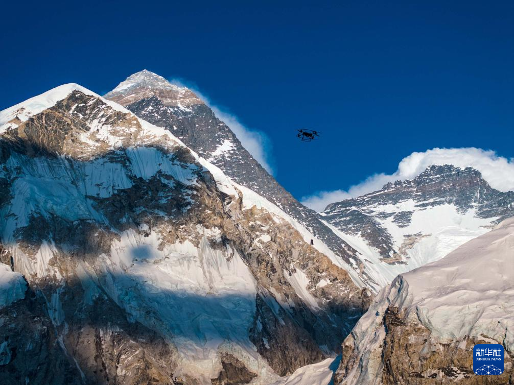 4月30日,大疆運載無人機在珠穆朗瑪峰尼泊爾一側進行物資運輸測試(視頻截圖)。新華社發(fā)