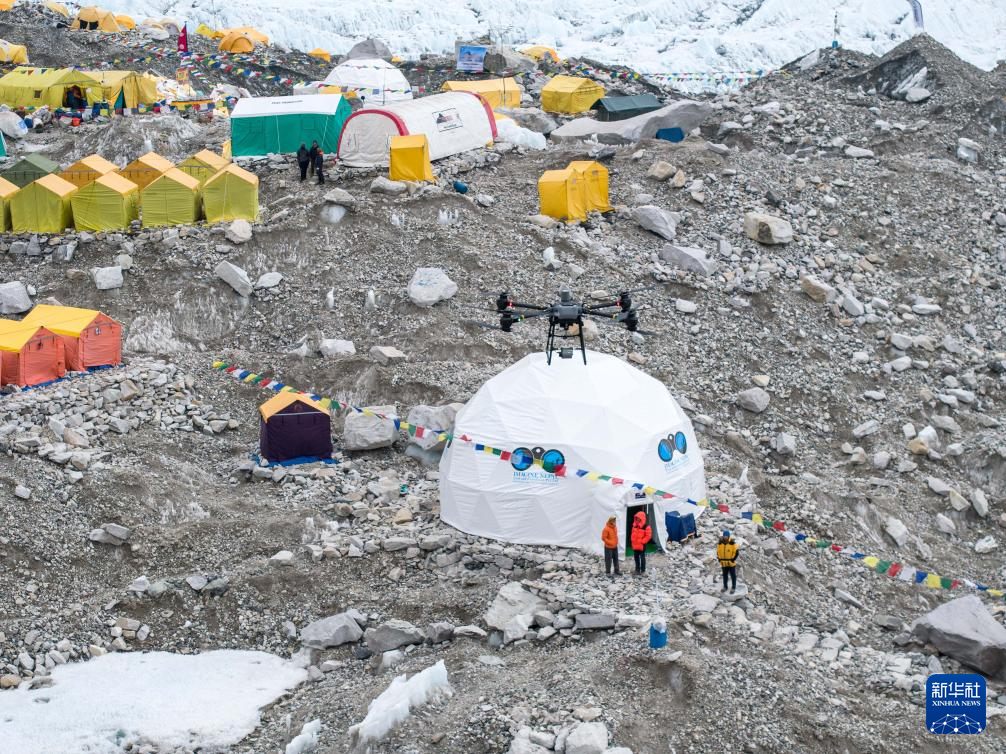 4月30日,大疆運載無人機在珠穆朗瑪峰南坡大本營進行物資運輸測試(視頻截圖)。新華社發(fā)