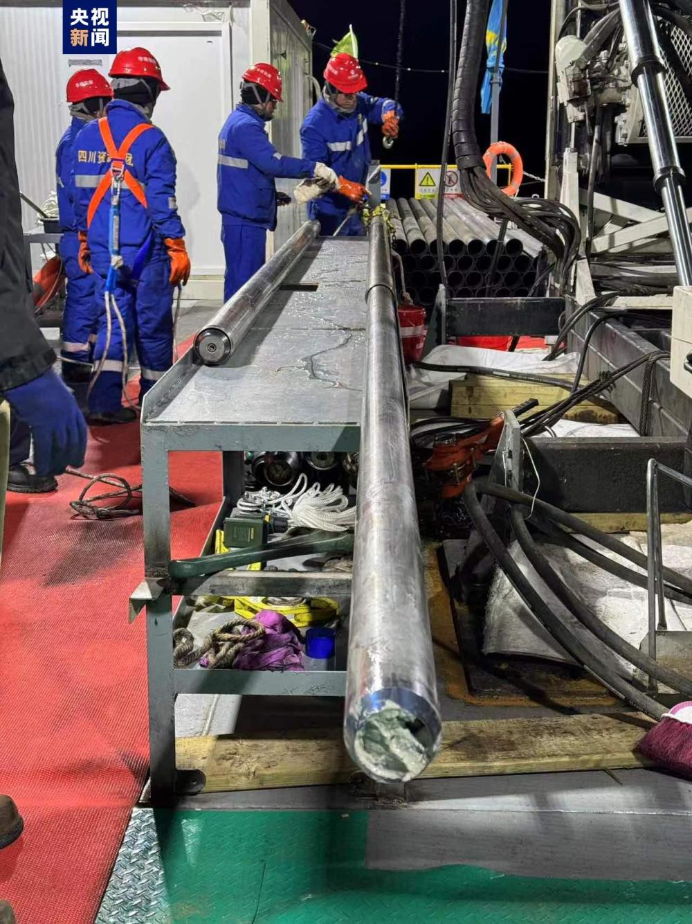 6月6日作為鉆芯的第一天,經(jīng)過不斷地調(diào)整和試驗(yàn),當(dāng)晚23時(shí)20分,第一次正式鉆探開始,鉆頭深入到了水下95米左右的位置,在第一個(gè)點(diǎn)位開始鉆取湖泊巖芯。23時(shí)40分,科考團(tuán)隊(duì)獲得了第一批湖泊巖心樣本??蒲袌F(tuán)隊(duì)每次鉆取3米一段,通過24小時(shí)輪班不間斷作業(yè),截至7日早6時(shí),已獲得9米長的巖芯。