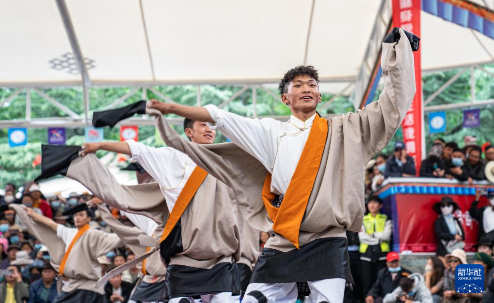 6月14日,參賽者在第二屆拉薩鍋莊舞大賽現(xiàn)場(chǎng)表演。新華社記者 丁增尼達(dá) 攝