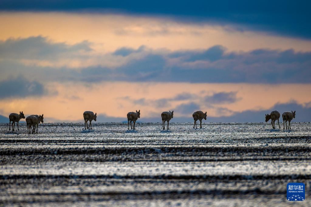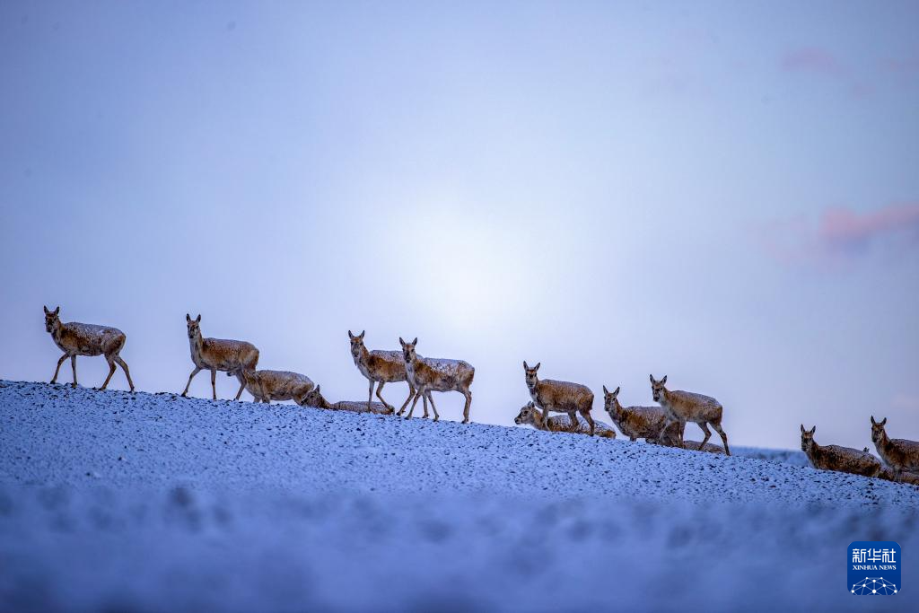 6月15日清晨雪后,在羌塘國家級(jí)自然保護(hù)區(qū),迎著朝霞前行在遷徙路上的一群藏羚羊。新華社記者 費(fèi)茂華 攝