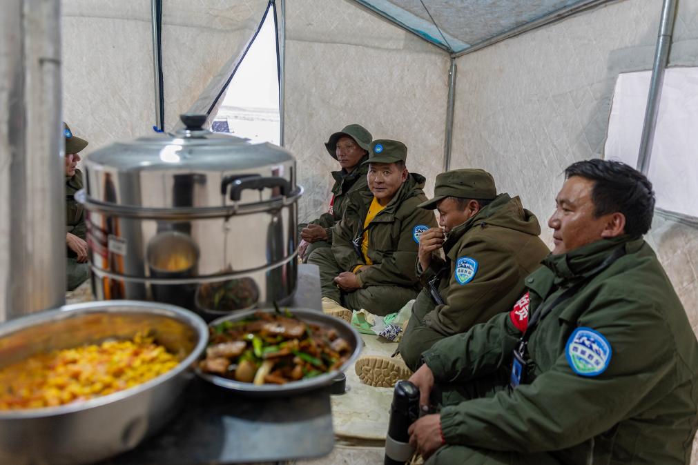 野生動(dòng)物專業(yè)管護(hù)隊(duì)員們在巡護(hù)途中宿營的帳篷內(nèi)準(zhǔn)備吃飯(5月7日攝)。新華社記者 姜帆 攝