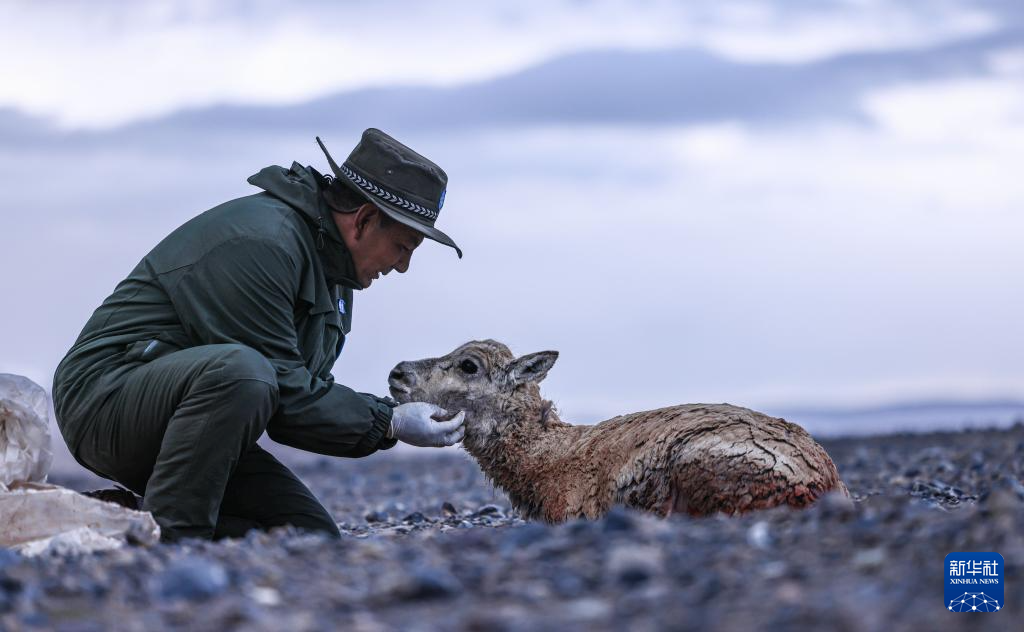 羌塘國家級自然保護(hù)區(qū)的野保員在安撫受傷的母藏羚羊(6月14日攝)。新華社發(fā)(旦增攝)