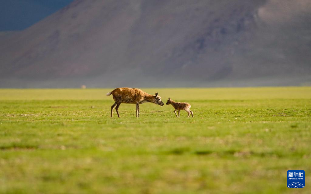 魯確塘草原上的藏羚羊母子(6月16日攝)。新華社記者 晉美多吉 攝