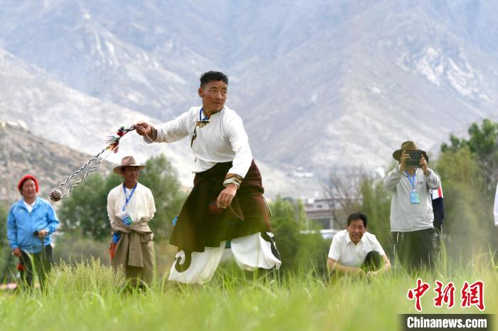古朵指的是用牦牛毛或者山羊毛編織成的拋石繩,可以將石頭投擲到較遠(yuǎn)的地方,是牧民們用來放牧的工具。圖為6月23日拉薩首屆農(nóng)牧民運(yùn)動(dòng)會(huì)上,參賽選手正進(jìn)行古朵比賽。中新社記者 李林 攝