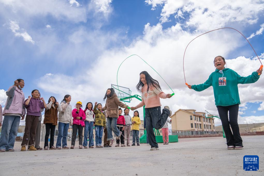 班戈縣中石化小學(xué)學(xué)生尼瑪措姆(右二)和同學(xué)們?cè)诓賵?chǎng)上跳繩(6月22日攝)。新華社記者 丁增尼達(dá) 攝