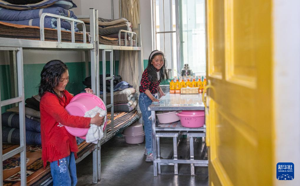 班戈縣中石化小學(xué)的學(xué)生在宿舍里打掃衛(wèi)生(6月22日攝)。新華社記者 丁增尼達(dá) 攝