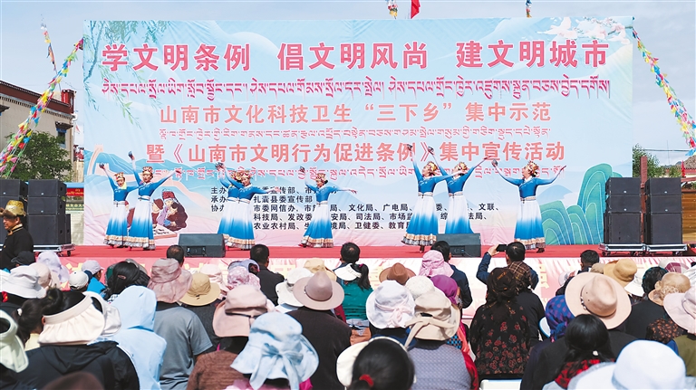 近日,山南市委宣傳部、市文明辦聯(lián)合扎囊縣委宣傳部在扎囊縣阿扎鄉(xiāng)章達(dá)村,開展了以“學(xué)文明條例 倡文明風(fēng)尚 建文明城市”為主題的山南市文化科技衛(wèi)生“三下鄉(xiāng)”集中示范暨《山南市文明行為促進(jìn)條例》集中宣傳活動?!D為活動現(xiàn)場。記者 汪純 攝
