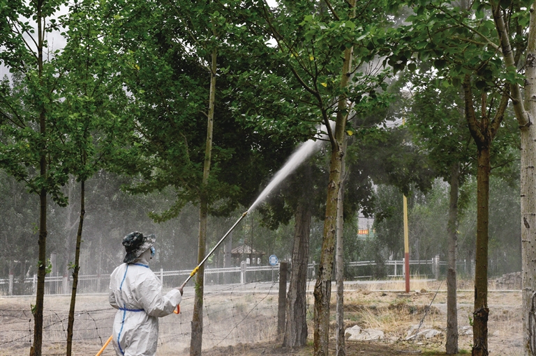 病因找到了,如何對癥下藥才是關(guān)鍵。防治隊將整片楊樹林分成三個區(qū)域,首先伐掉干死腐爛的樹,其次對病害區(qū)域進(jìn)行殺菌消毒?!懊總€區(qū)域我們噴灑的藥劑也不同,主要是想對防治效果進(jìn)行實驗。通過持續(xù)兩個月的觀察,發(fā)現(xiàn)第一組藥劑防治效果明顯,因此我們開始在整片楊樹林推廣第一組藥劑?!秉S敏說。