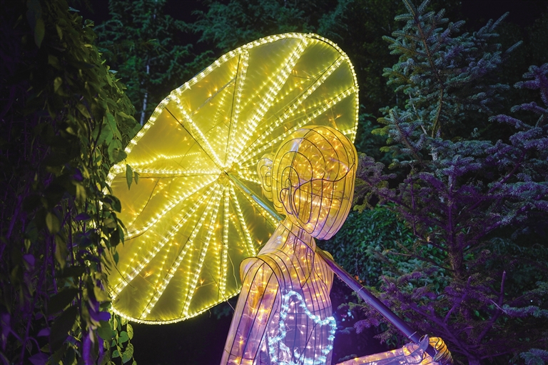 走進燈會現(xiàn)場,仿佛置身于一個夢幻般的世界,各式各樣的花燈錯落有致地分布在公園各個角落,令人目不暇接。宗角祿康公園的走廊里、草坪上,一盞盞精美的燈組在夜色的映襯下顯得更加璀璨奪目,展示出江南煙雨、小橋流水、青磚黛瓦、梅瓶明珠、桃花仙鶴、油傘折扇、上元燈彩等富有江蘇特色的美景雅韻,讓人似乎來到江南水鄉(xiāng),親身感受那一份寧靜與美好。當(dāng)然,此次燈會最引人矚目的便是“蘇拉一家親”大型燈組,運用拉薩經(jīng)典配色搭建飄逸的彩帶雙翼,再搭配拉薩的吉祥物牦牛和江蘇的吉祥物麋鹿,充分表達了“蘇拉一家親,攜手向未來”的寓意。