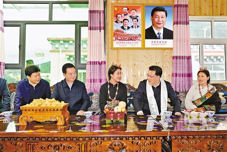 7月8日至10日,重慶市代表團(tuán)來藏考察。這是代表團(tuán)在昌都市類烏齊縣扎西貢村美麗鄉(xiāng)村示范點與基層群眾親切交流。 記者 旦增西旦 攝