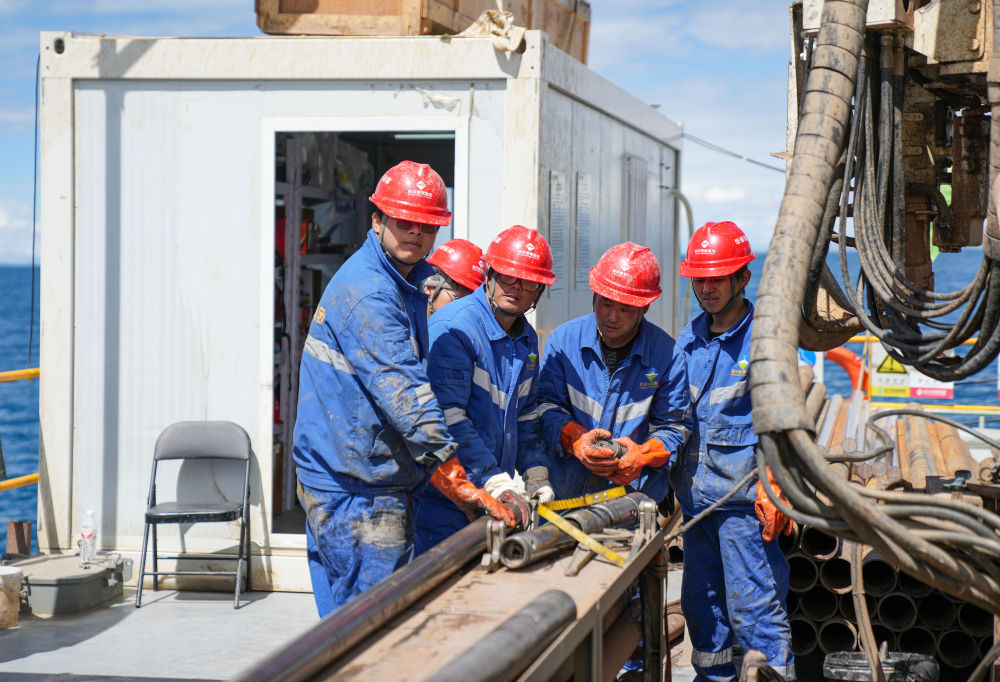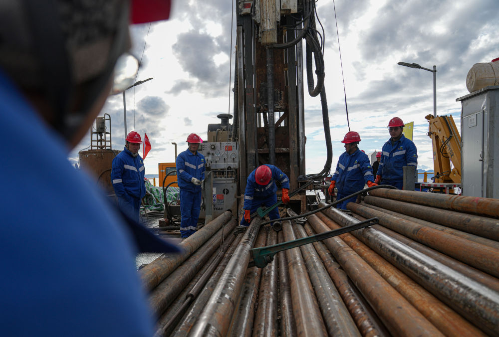 7月11日,鉆探隊(duì)隊(duì)員在準(zhǔn)備增加孔內(nèi)鉆桿。新華社記者 晉美多吉 攝