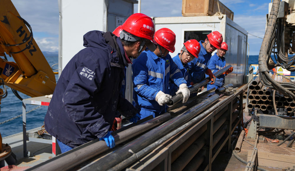 在海拔超過(guò)4700米的西藏納木錯(cuò)中心湖區(qū),21名來(lái)自五湖四海的鉆探專(zhuān)業(yè)技術(shù)人員,全天24小時(shí)輪班奮戰(zhàn)在面積僅200平方米的水上鉆探平臺(tái)上,協(xié)助第二次青藏科考科研人員提取湖泊巖芯樣品,這些樣本如同寶貝一樣,封存著青藏高原納木錯(cuò)地區(qū)百萬(wàn)年來(lái)的環(huán)境氣候變化信息。 擔(dān)任這次湖泊巖芯鉆探任務(wù)的是四川資源集團(tuán)華鋒鉆探隊(duì)。他們從5月31日入駐科考營(yíng)地、6月6日鉆取第一批湖泊巖芯樣品以來(lái)一直奮戰(zhàn)至今。這群平均年齡31歲的鉆探隊(duì)員常年工作在高海拔地區(qū),有著豐富的鉆探經(jīng)驗(yàn),此次鉆探是他們第一次進(jìn)行高海拔湖泊鉆探。目前納木錯(cuò)鉆探深度突破400米,達(dá)到國(guó)內(nèi)高海拔深水大湖的鉆探新紀(jì)錄。這些鉆探隊(duì)員在見(jiàn)證奇跡,也在創(chuàng)造歷史。