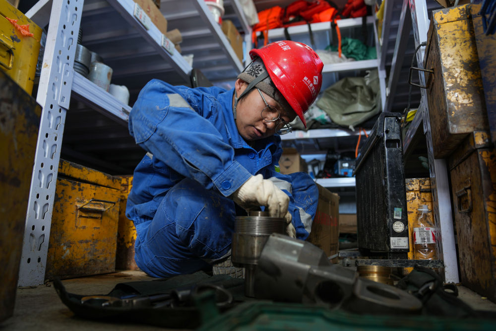 7月11日,鉆工劉文平在準(zhǔn)備拆卸鉆桿。新華社記者 晉美多吉 攝