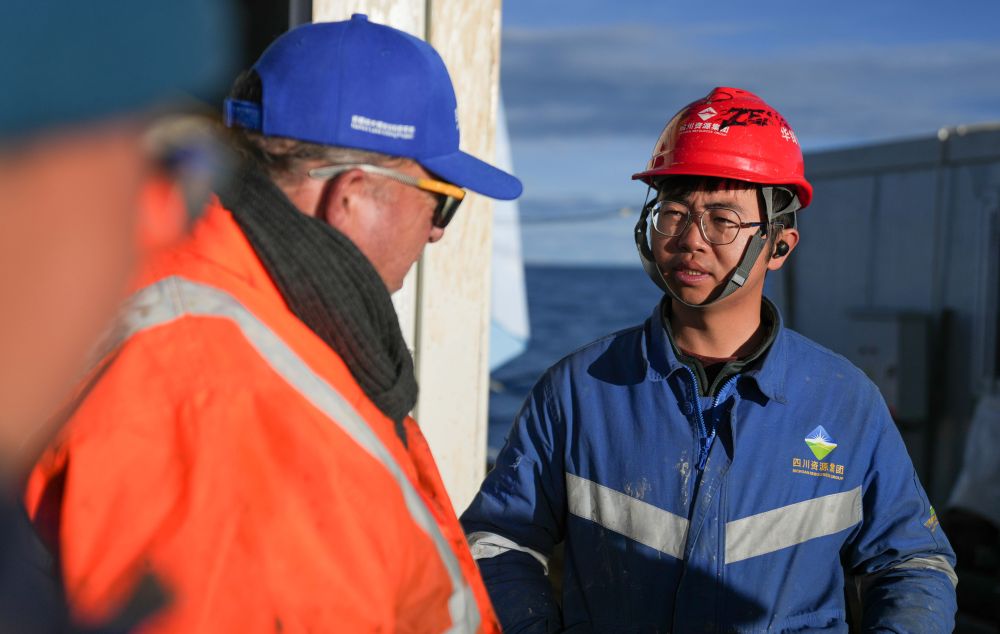 7月12日,鉆探隊(duì)員曾邦祐(右)在協(xié)助外國(guó)鉆探技術(shù)指導(dǎo)與鉆探隊(duì)進(jìn)行溝通。新華社記者 晉美多吉 攝