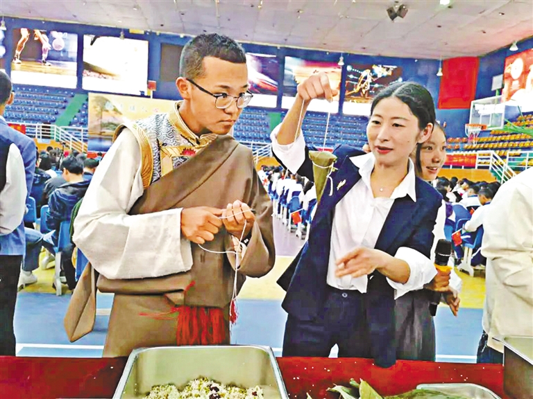 安徽援藏隊員手把手教山南二高學(xué)生包粽子。
