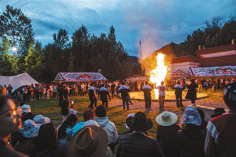 篝火晚會現(xiàn)場,參賽選手跳起了鍋莊(曲水站)。