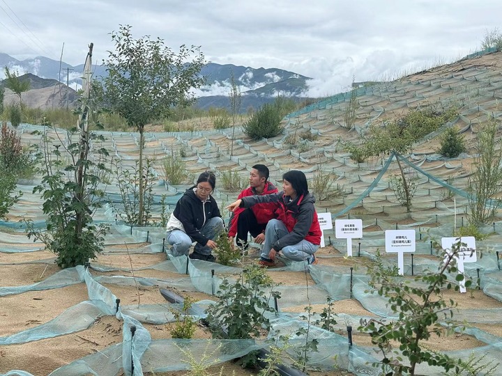 中國科學院成都山地災害與環(huán)境研究所研究員周萍帶領研究生在西藏扎囊縣沙化土地生態(tài)治理綜合示范區(qū)開展沙地試驗樣方植被生長狀況監(jiān)測。新華社記者 顧天成 攝