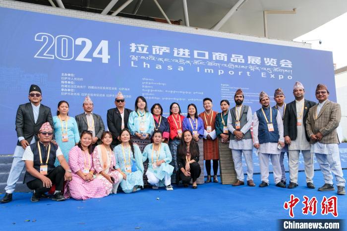 8月4日,來自尼泊爾和不丹的參展商在拉薩進(jìn)口商品展覽會開幕式現(xiàn)場合影留念。中新社記者 江飛波 攝