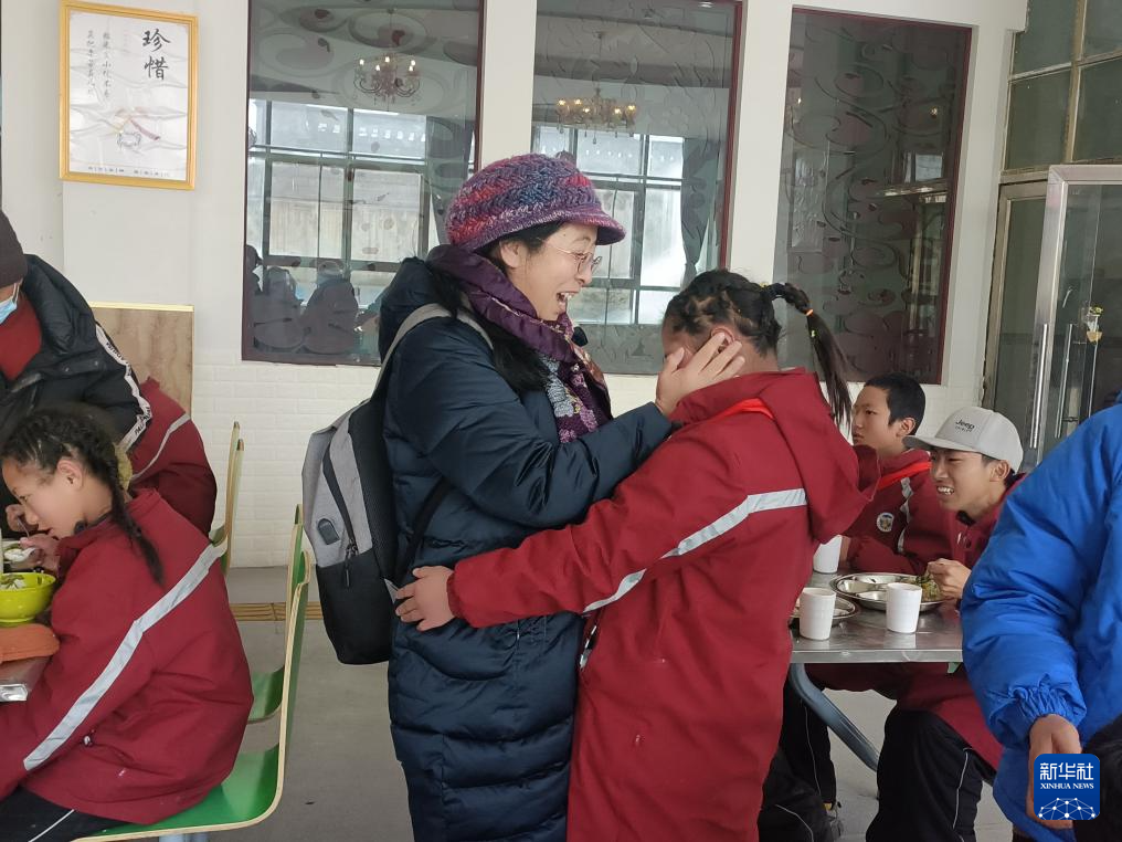 那曲市特殊教育學(xué)校的食堂里,次仁拉姆校長(zhǎng)和提前返校的學(xué)生見面(8月23日攝)。新華社發(fā)(白瑪朗杰攝)