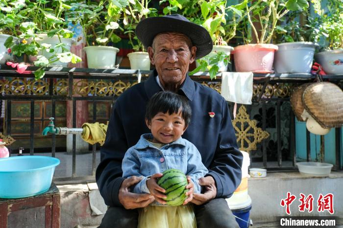 現年77歲的邊巴頓珠是彭倉村種大棚“第一人”。圖為8月23日,邊巴頓珠和孫女抱著一個自家種出來的大棚西瓜。記者 江飛波 攝