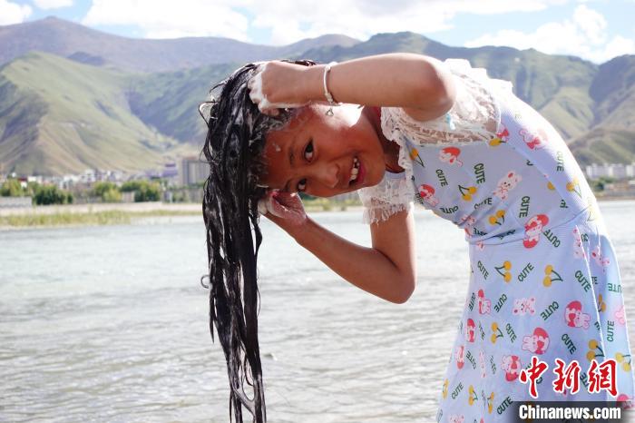 不少兒童在大人的看護(hù)下嬉戲玩水,9歲的強(qiáng)久措姆說(shuō):“我覺(jué)得在河邊洗澡特別有趣,能夠更好地親近大自然,還可以過(guò)林卡。”