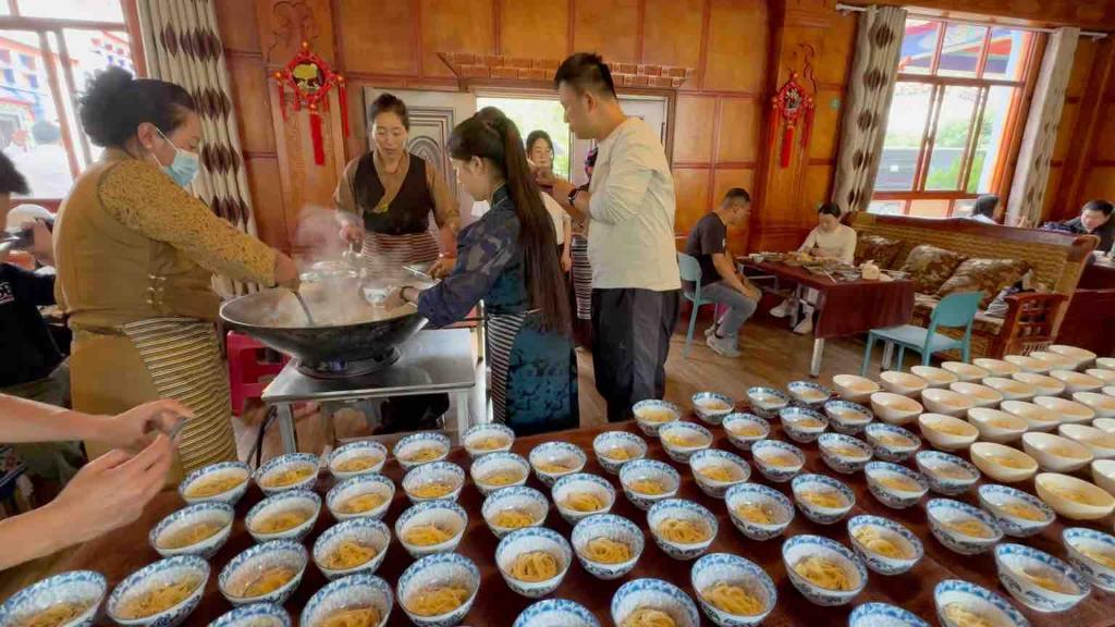 “目前店里紀(jì)錄保持在147碗?!痹诩{西民族鄉(xiāng)經(jīng)營(yíng)果拉叢農(nóng)家樂的果拉卓瑪說,“但生活再好也不能浪費(fèi)。我們會(huì)提醒客人,如果吃飽了,只需用筷子在碗上搭出尖尖,就會(huì)停止加面;但對(duì)于不搭筷子的客人,我們還會(huì)再勸一碗?!?/p>