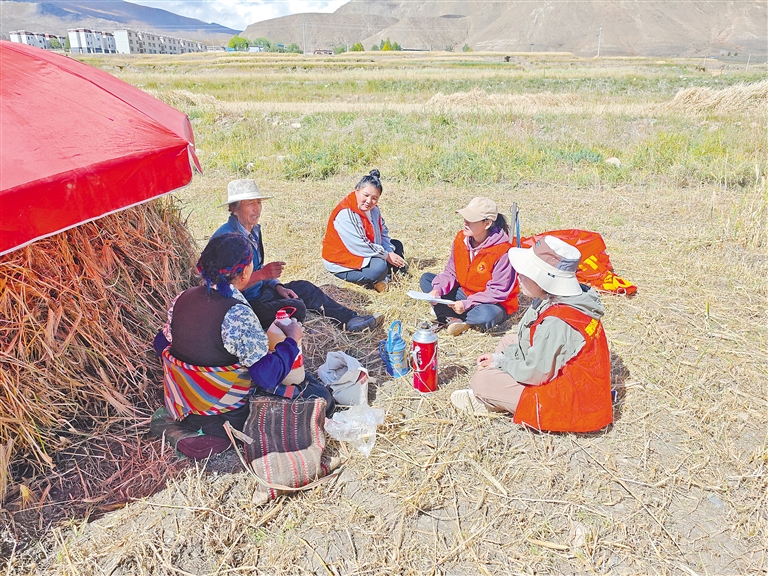 圖為民族團(tuán)結(jié)進(jìn)步宣傳活動月期間,薩迦縣志愿者在田間向群眾宣講民族團(tuán)結(jié)相關(guān)知識。