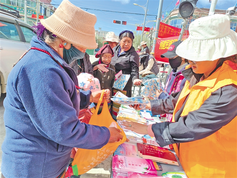 圖為薩迦縣民族團(tuán)結(jié)進(jìn)步宣傳活動月啟動儀式上,工作人員發(fā)放宣傳冊。