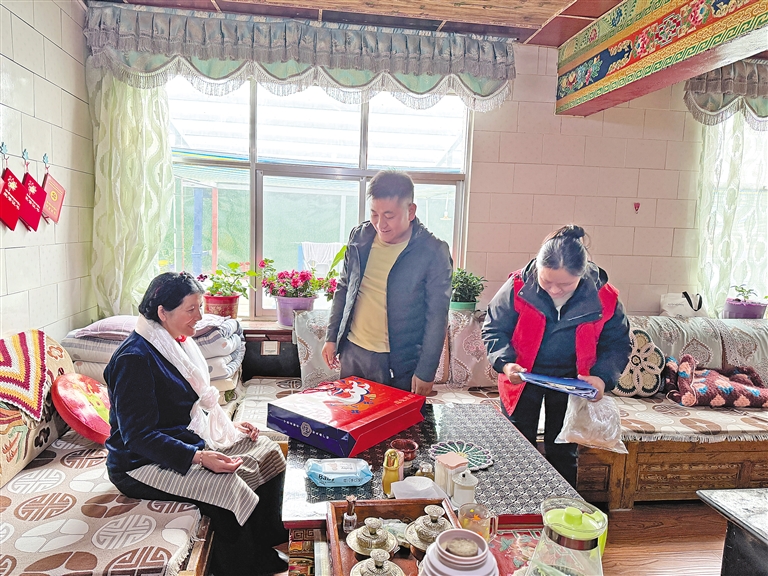 圖為亞東縣帕里鎮(zhèn)工作人員在民族團(tuán)結(jié)通婚家庭開展走訪慰問。(本版圖片均由記者 扎西頓珠 楊子彥 旦增嘎瓦 攝)