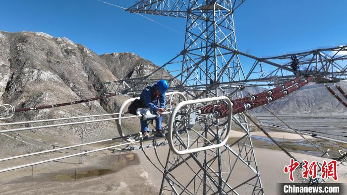 圖為國(guó)網(wǎng)青海超高壓公司輸電專業(yè)人員正在±400千伏柴拉線324號(hào)塔安裝分布式故障診斷器工作。劉玉斌 攝