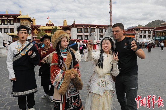 9月2日,西藏拉薩市八廓街,來自俄羅斯的巴德里(右一)與身穿藏族傳統(tǒng)服裝的年輕游客合影留念。近年來,來拉薩旅游,到八廓街、布達(dá)拉宮廣場拍一套藏服寫真,已經(jīng)成為進(jìn)藏旅游年輕人的“標(biāo)配”。中青報·中青網(wǎng)記者 孔斯琪/攝