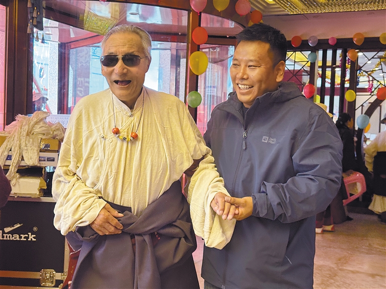 尼瑪是國家級非物質(zhì)文化遺產(chǎn)代表性項目卓舞(瓊結(jié)久河卓舞)國家級代表性傳承人。演出中,他擔任“卓本”(領(lǐng)舞者)角色,協(xié)調(diào)整個團隊11人的舞蹈動作和節(jié)奏?!拔矣H歷西藏翻天覆地的變化,看到如今的盛世,叫我們怎能不歌唱!”面對人們對他不顧年事“執(zhí)著”舞臺的疑問和驚嘆,尼瑪感嘆道。