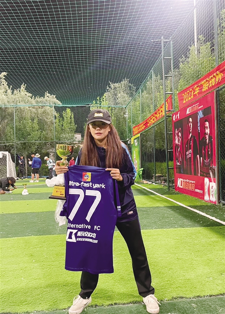 而最能證明她們訓(xùn)練成果的就是足球聯(lián)賽?!?023年“迎新杯”酷銳運(yùn)動(dòng)拉薩業(yè)余足球5人制(女子組)比賽、第二屆“亞克杯”女子5人制交流賽在拉薩開(kāi)賽,這也是西藏少有的女足賽事。米央以拉薩另類(lèi)女子足球隊(duì)隊(duì)員身份參賽,盡管米央是隊(duì)內(nèi)年紀(jì)最小的成員,但她的能力絲毫不遜于任何人。米央所在的這支由高中生、大學(xué)生等組成的隊(duì)伍,經(jīng)過(guò)10場(chǎng)比賽,拼盡全力最終奪得冠軍?!懊慨?dāng)足球在我腳下滾動(dòng)飛躍,每當(dāng)我奔跑在綠茵場(chǎng)上,那種肆意和快樂(lè)讓我堅(jiān)定我的選擇,我的夢(mèng)想是踢進(jìn)中國(guó)國(guó)家女子足球隊(duì)。”米央說(shuō)。雖然她與夢(mèng)想還有距離,但內(nèi)心那股熊熊燃燒的信念力量,成為她刻苦訓(xùn)練的“定心丸”。