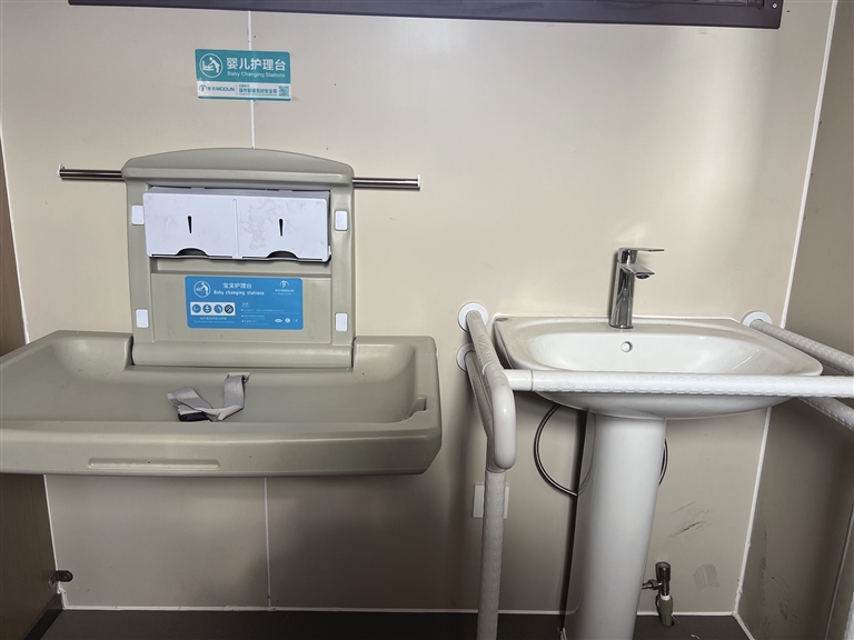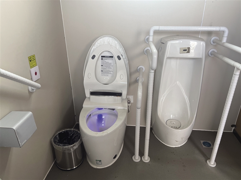 公廁內(nèi)部除了正常的蹲位,還設(shè)有第三衛(wèi)生間。第三衛(wèi)生間內(nèi)配有嬰兒護(hù)理臺、嬰兒安全座椅等設(shè)施。除此之外,第三衛(wèi)生間還設(shè)有安全扶手、智能馬桶等設(shè)備,方便腿腳不方便的老年人及殘疾人。智能馬桶旁還安裝有緊急報(bào)警器?!叭绻欣先嗽趲梗涂梢园匆幌戮o急報(bào)警器。這也是我們考慮到殘疾人、老年人如廁不方便,增設(shè)的人性化設(shè)計(jì)?!背嗔姓f。