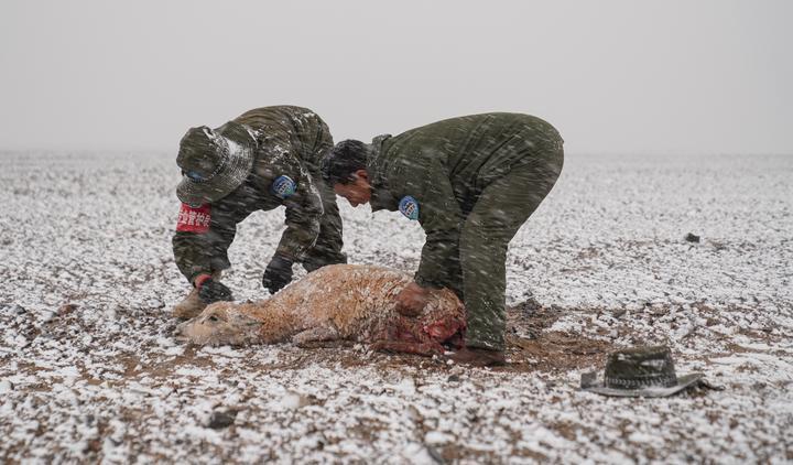受傷的母羊在漫天風雪中蹣跚了200多米后,倒下了。一直在觀望的索朗和羅布來到它身邊,輕輕地撫摸它的身體,口中念念有詞,然后用塑料布在母羊的腦袋旁邊“搭建”了一個小帳篷,為它擋風遮雪,幫它度過最后的時光。