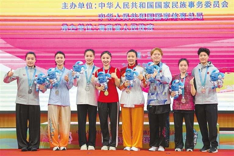 獲獎選手在頒獎儀式上合影,其中西藏代表團(tuán)選手趙爽(左四)獲得女子傳統(tǒng)雙器械一等獎。新華社記者 張麗蕓 攝