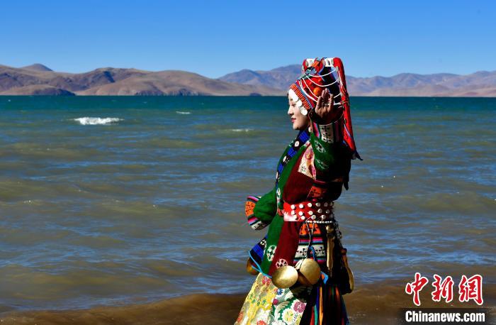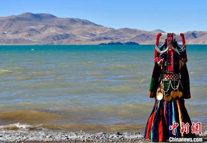 圖為12月7日,當(dāng)?shù)孛癖娫谏暝h格仁錯(cuò)湖畔展示巴扎服飾。中新社記者 李林 攝