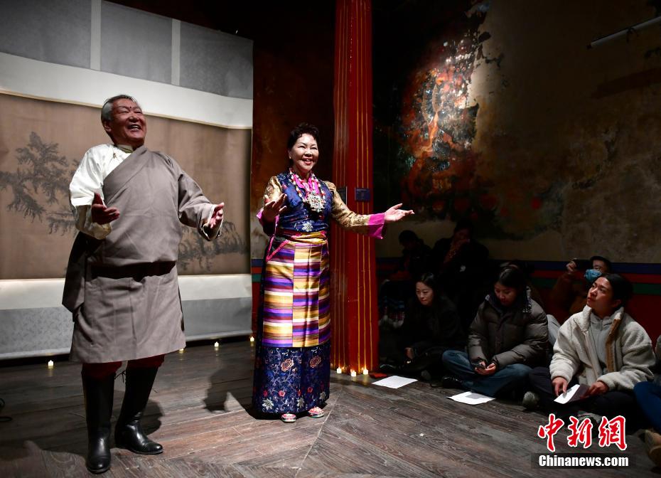 12月23日晚,西藏拉薩吉本崗藝術中心舉行吉光之夜活動。朗瑪堆諧、扎木念彈唱、熱巴舞等非遺展演,吸引眾多民眾共同領略西藏非物質文化遺產的無窮魅力。圖為扎木念彈唱《阿里札達民歌隆巴》。中新社記者 李林 攝