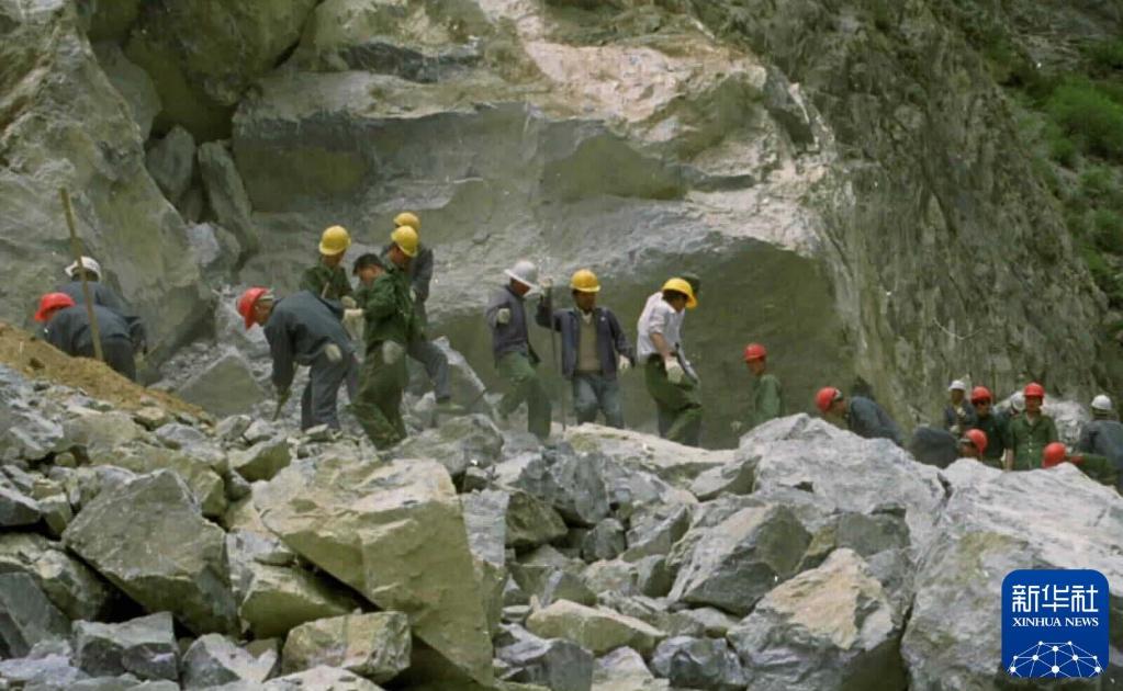 1950年,筑路大軍挺進(jìn)西藏途中,官兵們?cè)诒浯坦堑暮铀刑н\(yùn)石料。新華社發(fā)