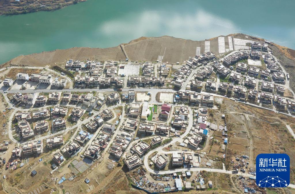 2019年4月16日,在川藏公路沿線的四川瀘定縣瀘橋鎮(zhèn)咱里村,移民新村面貌一新(無(wú)人機(jī)照片)。新華社記者 江宏景 攝