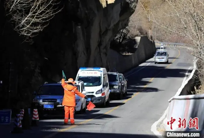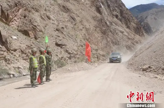 圖為護路期間,道班工人引導(dǎo)往來車輛。中新社記者 王磊 攝