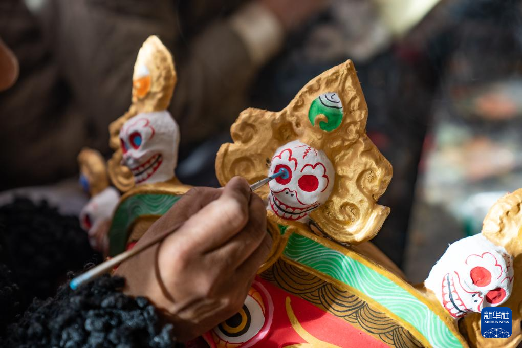 12月9日,拉薩達孜區(qū)雪鄉(xiāng)民間傳統(tǒng)手工藝農民專業(yè)合作社的面具制作工匠制作傳統(tǒng)面具。新華社記者 丁增尼達 攝